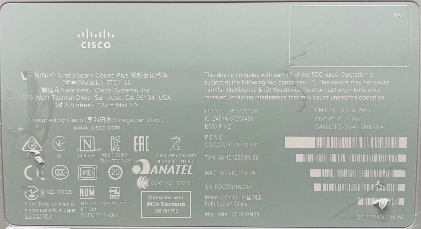 - CS-CODEC-PLUS V01 Cisco Spark Codec Plus TTC7-25