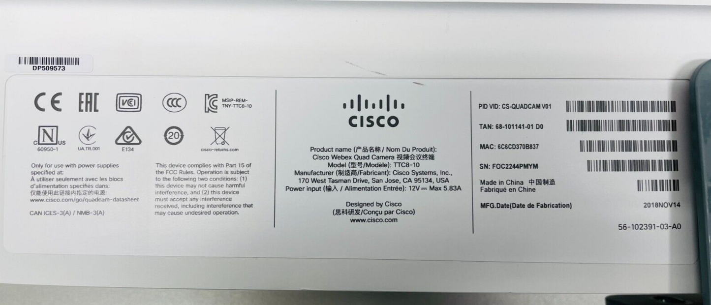 - CS-QUADCAM V01 Cisco Spark Quad Camera TTC8-10